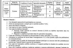 تعلن المدرسة الوطنية العليا للمناجمنت القليعة عن قتح مسابقة للتوظيف للسنة المالية 2021 على اساس الشهادة في المناصب التالية ads أستاذ مساعد قسم ب عدد المناصب 03 نمط التوظيف مسابقة على اساس الشهادة تاريخ نشر الاعلان : 18 جويلية 2021 اخر اجل لايداع الملفات …