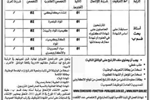 تعلن مديرية الخدمات الجامعية غليزان عن فتح مسابقة توظيف في الرتب المبينة ادناه ads طبيب عام في الصحة العمومية نمط التوظيف مسابقة على اساس الشهادة عدد المناصب 03 تاريخ نشر الاعلان : 19 جويلية 2021 اخر اجل لايداع الملفات 15 يوم من تاريخ الاعلان …