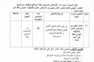 تعلن مديرة دار الاشخاص المسنين باتنة عن فتح مسابقة توظيف على اساس الاختبار المهني لشغل المناصب الموضحة ادناه ads عامل مهني من المستوى الاول بالتوقيت الجزئي لعقد غير محدد المدة عدد المناصب 01 حارس بالتوقيت الكامل لعقد غير محدد المدة عدد المناصب 01 تاريخ …