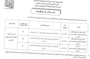 وزارة التعليم العالي والبحث العلمي المدرسة العليا للفلاحة الصحراوية بالوادي ads إعلان توظيف تعلن عن مسابقة للمدرسة العليا للفلاحة الصحراوية بالوادي عن فتح مسابقة للتوظيف على أساس الاختبار المهني في الرتب المبينة أدناه: يجب أن يحتوي ملف الترشح على الوثائق التالية: نسخة من وثيقة …