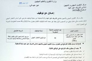 وزارة التكوين و التعليم المهنيين مركز التكوين المهني و التمهين الشريف دنداني عين عبيد ads إعلان عن توظيف 17 جوان 2025 يعلن مركز التكوين المهني و التمهين التمهين الشريف دنداني عين عبيد عين عبيد ولاية قسنطينة عن عملية توظيف خارجي على أساس الإختبار المهني …