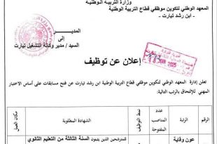 وزارة التربية الوطنية المعهد الوطني لتكوين موظفي قطاع التربية الوطنية – ابن رشد تيارت – ads إعلان عن توظيف تعلن إدارة المعهد الوطني لتكوين موظفي قطاع التربية الوطنية ابن رشد تيارت عن فتح مسابقات على أساس الاختيار المهني للالتحاق بالرتب التالية: الرقمالرتبةعدد المناصب المفتوحةنمط …