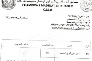 أكمل القراءة »يفتح النادي الرياضي النادي الرياضي أبطال مدينة بئر خادم ابواب التوظيف في المناصب التالية