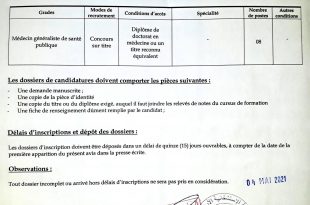 تعلن المؤسسة العمومية للصحة الجوارية الأربعاء نايث ايراثن بولاية تيزي وزو عن فتح مسابقة توظيف على اساس الشهادة في الرتب المبينة ادناه : ads طبيب عام في الصحة العمومية عدد المناصب : 08 مناصبتاريخ نشر الاعلان : 04 ماي 2021
