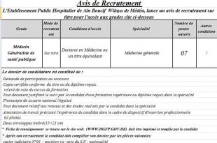 تعلن المؤسسة الاستشفائية عين بوسيف المدية عن فتح مسابقة للتوظيف في الرتب المبينة ادناه ads طبيب عام في الصحة العمومية عدد المناصب المالية 02 مناصب نمط التوظيف على أساس الشهادة