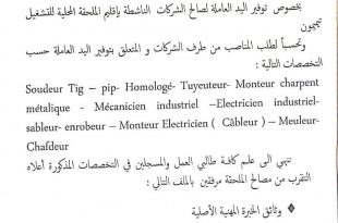 الملحقة المحلية للتشغيل مستغانم عــرض عـــمــل️ كـلاسـيـكـي ads الهيئة المستخدمة: GIPLAIT/SPA المهنة : عامل يدوي عدد المناصب : 02 المهنة : تقني صيانة عدد مناصب : 01 مجال النشاط : صناعي ملاحظة: يرجى من المهتمين المهتمين بالعروض، التقرب من الملحقة المحلية للتشغيل مستغانم.
