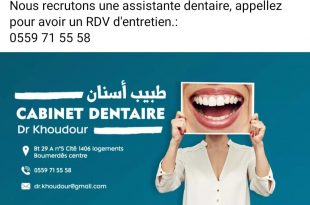 عيادة جراحة الأسنان “Dr Khoudour” المتواجدة بحي 1406 مسكن بولاية بومرداس توظف :✓ مساعدة طبيب أسنان (Assistante dentaire)يرجى الإتصال برقم الهاتف المدون في الصورة المرفقة لأخذ موعد المقابلة. ads