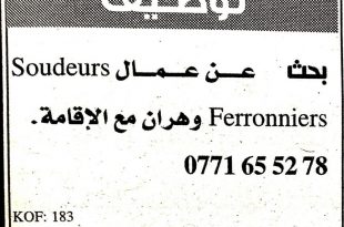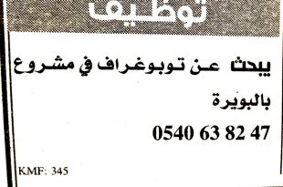 اعلانات توظيف ننقلها لكم من الجرائد لنهار اليوم ملاحظة كل اعلان مرفق معه طريقة التواصل مع صاحب الاعلان بريد الكتروني او رقم هاتف 1 يبحث عن توبوغراف لي مشروع في ولاية البويرة . ads 2 منقول من journal quotidien d oranعيادة طبية توظفمختص في …