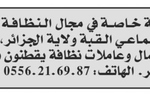 اعلانات توظيف منقول من جريدة الشروق لنهار اليومتوظيف بولاية تيزي وزوممرض .مساعد تمريض .مرافق مريض رجل رقم الهاتف 0774254070 ads شركة خاصة في مجال النظافة مقرها الاجتماعي القبة ولاية الجزائر تبخث عن عمال وعاملات نظافة يقطنون بولاية الجزائر رقم الهاتف 0556216987