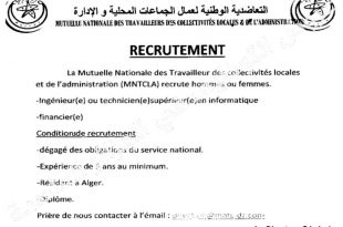 التعاضدية الوطنية لعمال الجماعات المحلية و الإدارة و الكائن مقرها بحي زرهوني مختار، المحمدية بالجزائر العاصمة توظف :✓ مهندس(ة) أو تقني(ة) سامي(ة) في الإعلام الآلي✓ مختص(ة) في المالية ads *شروط المنصبين موضحة بالتفصيل في الصورة المرفقةيرجى التواصل عن طريق البريد الإلكتروني التالي :[email protected]