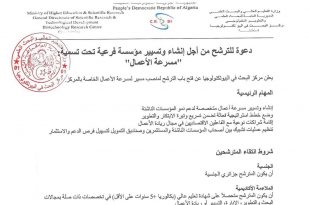 وزارة التعليم العالي والبحث العلمي المديرية العامة للبحث العلمي والتطوير التكنولوجي مركز البحث في البيوتكنولوجيا دعوة للترشح من أجل إنشاء وتسيير مؤسسة فرعية تحت تسمية: “مسرعة الأعمال” ads يعلن مركز البحث في البيوتكنولوجيا عن فتح باب الترشح لمنصب مسير مسرعة الأعمال الخاصة بالمركز. المهام …