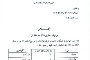 ولاية البويرة مديرية المواصلات السلكية واللاسلكية الوطنية مصلحة الإدارة والإعداد إعلان ads عن توظيف خارجي (تكفل بعد عملية نقل) تعلن مديرية المواصلات السلكية واللاسلكية الوطنية لولاية البويرة عن فتح توظيف خارجي عن طريق التكفل بعد عملية النقل للالتحاق بالرتب المبينة في الجدول الآتي: الرتبةعدد …
