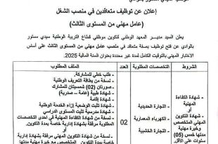وزارة التربية الوطنية المعهد الوطني لتكوين موظفي قطاع التربية الوطنية سيدي مستور بالوادي ads إعلان عن توظيف متعاقدين في منصب الشغل يعلن السيد مدير المعهد الوطني لتكوين موظفي قطاع التربية الوطنية سيدي مستور بالوادي عن فتح توظيف بصفة متعاقد بعنوان السنة المالية 2025. في …