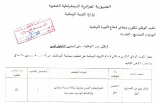وزارة التربية الوطنية المعهد الوطني لتكوين موظفي قطاع التربية الوطنية الورود و البنفسج – البليدة إعلان عن التوظيف على أساس الاختبار المهني ads يعلن المعهد الوطني لتكوين موظفي قطاع التربية الوطنية عن تنظيم مسابقة التوظيف على أساس اختيار مهني للالتحاق بمناصب الشغل التالية: منصب …