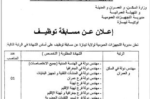 وزارة السكن، و العمران و المدينة و التهيئة العمرانية مديرية التجهيزات العمومية لولاية تيبازة ads إعلان عن مسابقة توظيف تعلن مديرية التجهيزات العمومية لولاية تيبازة عن مسابقة توظيف على أساس الشهادة في الرتبة التالية: الرتبةالشهادة المطلوبة ( التخصص )عدد المناصبمهندس دولة في السكن و …