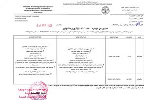 وزارة التعليم العالي و البحث العلمي جامعة محمد الشريف مساعدية سوق أهراس كلية العلوم و التكنولوجيا ads سوق أهراس في: 14 اكتوبر 2025 إعلان عن توظيف الأساتذة المؤقتين و المشاركين تعلن إدارة كلية العلوم والتكنولوجيا عن توظيف الأساتذة المؤقتين و المشاركين في بعض التخصصات …