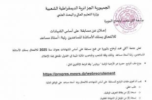 وزارة التعليم العالي والبحث العلمي جامعة أكلي محند أولحاج البويرة ads إعلان عن مسابقة على أساس الشهادات للإلتحاق بسلك الأساتذة المساعدين رتبة: أستاذ مساعد تعلن جامعة أكلي محند أولحاج البويرة عن فتح مسابقة على أساس الشهادات بعنوان سنة 2025 للإلتحاق بسلك الأساتذة المساعدين رتبة …