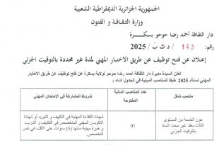 إعلان عن فتح توظيف عن طريق الاختبار المهني لمدة غير محددة بالتوقيت الجزئي ads تعلن السيدة مديرة دار الثقافة أحمد رضا حوحو لولاية بسكرة عن فتح توظيف عن طريق الاختبار المهني لسنة 2025 طبقا للمناصب المهنية في الجدول أدناه: منصب شغلعدد المناصب المالية المفتوحةشروط …