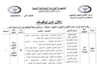 وزارة التكوين و التعليم المهنيينمركز التكوين المهني و التمهين الوطاية (بسكرة) ads إعلان عن توظيف يعلن السيد مدير مركز التكوين المهني و التمهين – الوطاية – عن فتح مسابقة للتوظيف في الرتب المبينة أدناه: ملحق إدارة عامل مهني من المستوى الأول على الراغبين بالمشاركة …