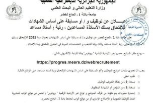 وزارة التعليم العالي و البحث العلمي جامعة باتنة 1 – الحاج لخضر ads إعلان عن توظيف و / أو مسابقة على أساس الشهادات للالتحاق بسلك الأساتذة المساعدين، رتبة: أستاذ مساعد، دورة: يُعلن مدير جامعة باتنة 1، الحاج لخضر عن فتح توظيف و/أو مسابقة على …