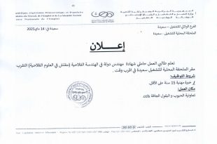 أكمل القراءة »مطلوب من طالبي العمل حامل شهادة مهندس دولة في الهندسة الفلاحية التقرب من مقر الملحقة المحلية للتشغيل لتوجيهه في عرض عمل