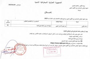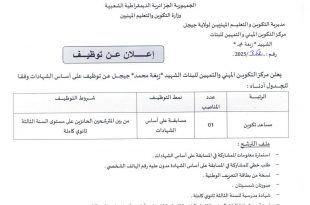 وزارة التكوين والتعليم المهنيين مركز التكوين المهني والتمهين للبنات الشهيد “زيغة محمد” جيجل ads إعلان عن توظيف يعلن مركز التكوين المهني والتمهين للبنات الشهيد “زيغة محمد” جيجل عن توظيف على أساس الشهادات وفقا لما هو أدناه: مديرية التربية تفتح مسابقة توظيف العمال المهنيين 180 …