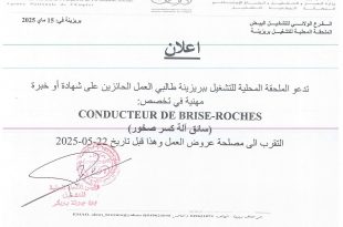 وزارة العمل و التشغيل و الضمان الاجتماعي الوكالة الوطنية للتشغيل الفرع الولائي للتشغيل ببريزينة الملحقة المحلية للتشغيل ببريزينة ads إعلان تدعو الملحقة المحلية للتشغيل ببريزينة طالبي العمل الحائزين على شهادة أو خبرة مهنية في تخصص: CONDUCTEUR DE BRISE-ROCHES (سائق آلة كسر صخور) التقرب إلى …