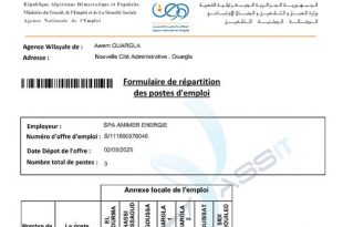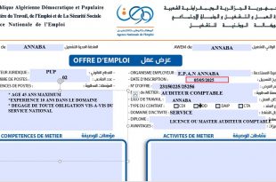وزارة العمل والتشغيل والضمان الاجتماعي الوكالة الوطنية للتشغيل الفرع الولائي للتشغيل عنابة ads عَرْض عمل الهيئة المستخدمة: E.P.A.N ANNABA القطاع القانوني: عام عدد المناصب: 02 المؤهلات المطلوبة: السن 45 سنة كحد أقصى خبرة 10 سنوات في المجال الإعفاء من كل التزام تجاه الخدمة الوطنية …