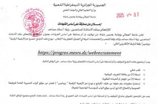 أكمل القراءة »إعلان عن مسابقة على أساس الشهادات للإلتحاق بسلك الأساتذة المساعدين رتبة: أستاذ مساعد
