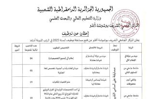وزارة التعليم العالي والبحث العلمي المركز الجامعي الشريف بوشوشة – آفلو ads إعلان عن توظيف يعلن المركز الجامعي الشريف بوشوشة – آفلو عن فتح مسابقة توظيف لسنة 2025 في الرتب المبينة أدناه: الرتبةنمط التوظيفشروط الالتحاقالتخصص المطلوبعدد المناصب المفتوحةمهندس دولة في الإعلام الآليمسابقة على أساس …
