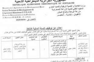 أكمل القراءة »إعلان عن توظيف في المعهد التقني لتنمية الزراعة الصحراوية