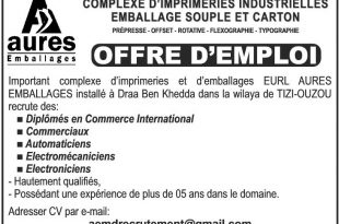 مجمع المطابع الصناعية التغليف المرن والكرتون ما قبل الطباعة – الأوفست – الروتاتيف – الفليكسوغرافيا – الطباعة البارزة ads اعلان توظيف مجمع هام للطباعة والتغليف أوراس للتغليف ذ.م.م. الكائن بدائرة ذراع بن خدة بولاية تيزي وزو يوظف: حائزين على شهادات في التجارة الدولية تجار …
