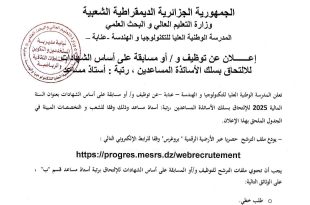 إعلان عن توظيف للالتحاق بسلك الأساتذة المساعدين في المدرسة الوطنية العليا للتكنولوجيات المتقدمة – الجزائر