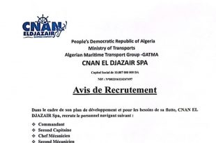 وزارة النقل المجموعة الجزائرية للنقل البحري -GATMA الشركة الوطنية الجزائرية للملاحة البحرية ads إعلان توظيف في إطار مخططها للتنمية و لتلبية احتياجات أسطولها، الشركة الوطنية الجزائرية للملاحة البحرية، توظف المستخدمين الملاحين التاليين: قبطان سفينة مساعد قبطان رئيس مهندس بحري مهندس بحري ثان ملازم أول …