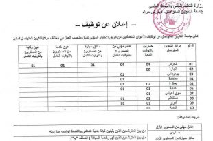 وزارة التعليم العالي والبحث العلمي جامعة التكوين المتواصل – ديدوش مراد ads إعلان عن توظيف تعلن جامعة التكوين المتواصل عن تنظيم مسابقات التوظيف للأعوان المتعاقدين على طريق الاختبار المهني لشغل المناصب المبينة في مختلف مراكز التكوين المتواصل كما يلي: الرقممراكز التكوين المتواصلحارس بالتوقيت الكاملعامل …