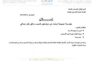 وزارة العمل و التشغيل و الضمان الاجتماعي الوكالة الوطنية للتشغيل الفرع الولائي للتشغيل بالجلفة الملحقة المحلية للتشغيل بالجلفة ads الجلفة في : 2025/04/29 إعلان مؤسسة عمومية تبحث عن مرشحين في المناصب التالية: دهان هياكل – Tôlier peintre – متطلبات المنصب: السن لا يتجاوز 35 …