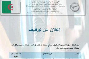 السلطة الحكومية للتصديق الإلكتروني ads إعــلان عـن تـوظـيـف تعلن السلطة الحكومية للتصديق الإلكتروني، عن فتح مسابقة للتوظيف على أساس الشهادة في منصب وثائقي أمين محفوظات حسب الشروط المبينة أدناه: المنصبشروط الإلتحاقعدد المناصب المالية المفتوحةوثائقي أمين محفوظات– المتحصلون الحائزون على شهادة ماستر أو ليسانس، أو …