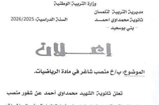 أكمل القراءة »مديرية التربية… اعلان عن شغور منصب أستاذ مادة الرياضيات بثانوية محمداوي احمد – بني بوسعيد