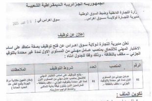 وزارة التجارة الداخلية وضبط السوق الوطنية مديرية التجارة لولاية سوق أهراس ads سوق اهراس في : 08 أكتوبر 2025 إعلان عن توظيف تعلن مديرية التجارة لولاية سوق اهراس عن فتح توظيف بصفة متعاقد على أساس الاختبار المهني للالتحاق بمنصب عامل مهني من المستوى الأول …