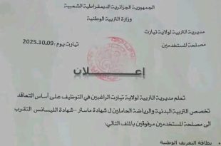 وزارة التربية الوطنية مديرية التربية لولاية تيارت ads تيارت يوم: 09-10-2025 إعلان تعلم مديرية التربية لولاية تيارت الراغبين في التوظيف على أساس التعاقد تخصص التربية البدنية والرياضية الحاملين لشهادة ماستر – شهادة الليسانس التقرب الى مصلحة المستخدمين مرفوقين بالملف التالي: بطاقة التعريف الوطنية شهادة …