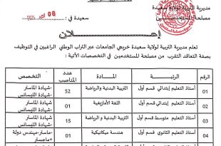 وزارة التربية الوطنية مديرية التربية لولاية سعيدة ads سعيدة في: 08 اكتوبر 2025 إعلان تعلم مديرية التربية لولاية سعيدة خريجي الجامعات عبر التراب الوطني الراغبين في التوظيف بصفة التعاقد التقرّب من مصلحة المستخدمين في التخصصات الآتية: الرقمالرتبالمادةالتخصصعدد المناصب01أستاذ تعليم ابتدائي قسم أولالتربية البدنية والرياضية– …