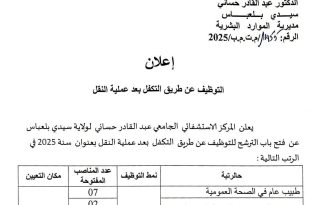 وزارة الصحة المركز الاستشفائي الجامعي الدكتور عبد القادر حساني سيدي بلعباس ads إعلان التوظيف عن طريق التكفل بعد عملية النقل يعلن المركز الاستشفائي الجامعي عبد القادر حساني لولاية سيدي بلعباس عن فتح باب الترشح للتوظيف عن طريق التكفل بعد عملية النقل بعنوان سنة 2025 …