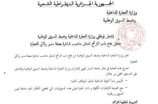 وزارة التجارة الداخلية وضبط السوق الوطنية ads إشعار لموظفي وزارة التجارة الداخلية وضبط السوق الوطنية متعلق بفتح باب الترشح لشغل مناصب شاغرة بصفة مدير ولائي للتجارة تعلن وزارة التجارة الداخلية وضبط السوق الوطنية عن فتح باب الترشح لشغل مناصب شاغرة بصفة مدير ولائي للتجارة. …