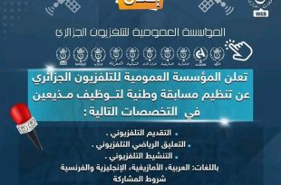 إعلان المؤسسة العمومية للتلفزيون الجزائري ads تعلن المؤسسة العمومية للتلفزيون الجزائري عن تنظيم مسابقة وطنية لتوظيف مذيعين في التخصصات التالية: التقديم التلفزيوني. التعليق الرياضي التلفزيوني. التنشيط التلفزيوني. باللغات: العربية، الأمازيغية، الإنجليزية والفرنسية. شروط المشاركة: شهادة جامعية. على الراغبين في المشاركة إرسال عبر البريد الإلكتروني …
