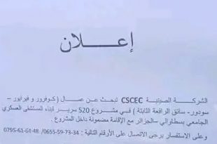 إعــــــــــلان ads الشركة الصينية CSCEC تبحث عن عمال (كورودور و فيرايور – سودور – سائق الرافعة الثابتة) في مشروع 520 سرير لبناء المستشفى العسكري الجامعي ببشار – الجزائر مع الإقامة مضمونة داخل المشروع. وعلى المهتمين يرجى الاتصال على الأرقام التالية : 0655-59-73-34 / 0795-61-64-48 …