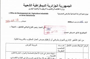 وزارة الفلاحة والتنمية الريفية والصيد البحري ديوان تنمية الزراعة الصناعية بالأراضي الصحراوية رئيس الفرع الولائي للتغيل – المنيعة – ads في: 10 أفريل 2025 عرض عمل عرض العمل مطلوب بالشروط التالية: الرقمالرتبة/منصب الشغلالعددشروط العرض01رئيس قسم الوسائل العامة01– شهادة ماستر في إدارة الأعمال، المحاسبة والمالية، …
