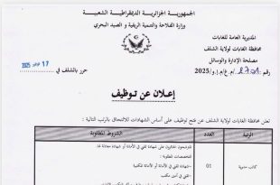 المديرية العامة للغابات محافظة الغابات لولاية الشلف مصالح الإدارة والوسائل ads إعلان عن توظيف تعلن محافظة الغابات لولاية الشلف عن فتح توظيف على أساس الشهادة للالتحاق بالرتب التالية: وزارة الفلاحة والتنمية الريفية والصيد البحري المديرية العامة للغابات محافظة الغابات لولاية المسيلة إعلان عن توظيف …
