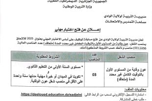 وزارة التربية الوطنية مديرية التربية لولاية الوادي مصلحة التمدرس والامتحانات ads إعلان عن فتح اختبار مهني تعلن مديرية التربية لولاية الوادي عن فتح مسابقة توظيف على أساس الاختبار المهني بعنوان 2025 للالتحاق بمنصب الشغل: منصب الشغلعدد المناصبالشروط المطلوبةسائق سيارة من المستوى الأول بالتوقيت الكامل …