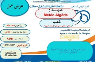 الوكالة الوطنية للتشغيل وزارة العمل والتشغيل والضمان الاجتماعي الفرع الولائي للتشغيل الملحقة المحلية للتشغيل – جانت ads عرض عمل المؤسسة : Météo Algérie المنصب : تقني / تقني سامي في الأرصاد الجوية مدة صلاحية العرض : 03 أيام نوع العرض : CDD تاريخ العرض …