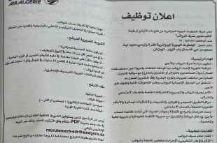 الخطوط الجوية الجزائرية إعلان توظيف ads تُعلن شركة الخطوط الجوية الجزائرية عن فتح باب الترشح لوظيفة مدير الموارد البشرية (بمقر الشركة – الجزائر). مكان العمل: الخطوط الجوية الجزائرية المقر الرئيسي صعيد آيت حسين، حي الأعمال باب الزوار – الجزائر. المهام الرئيسية: تحرير سياسة صرف …